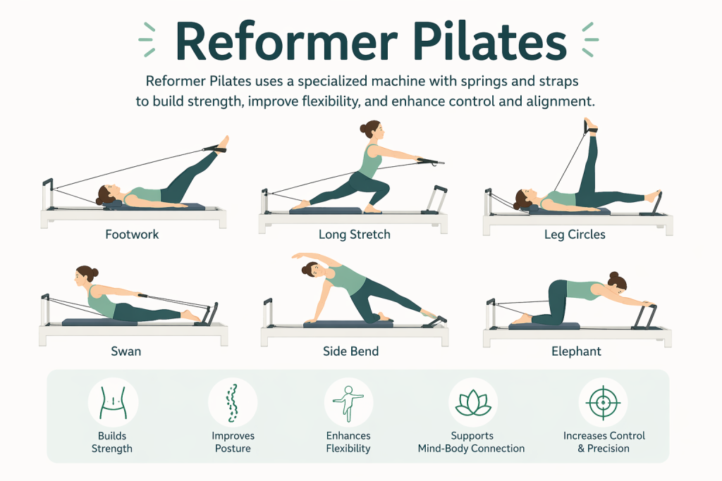Reformer Pilates uses specialized equipment that provides adjustable resistance.