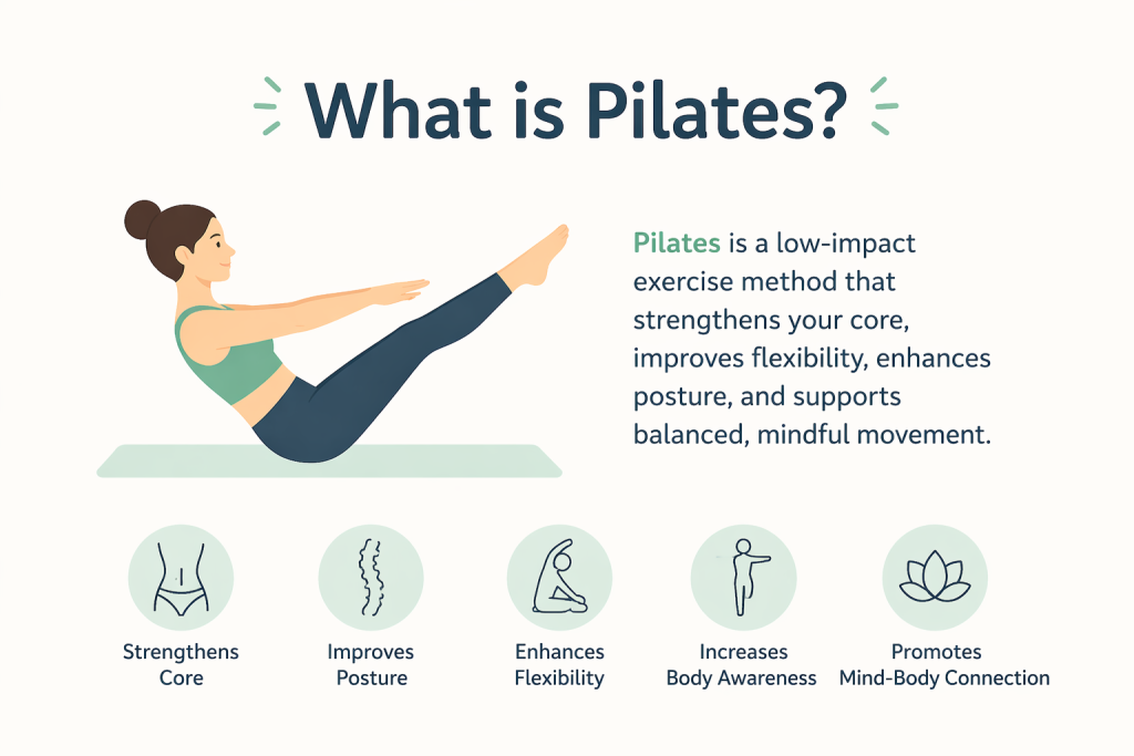 Pilates is a low-impact exercise method designed to strengthen the core muscles, improve flexibility, and support better posture.