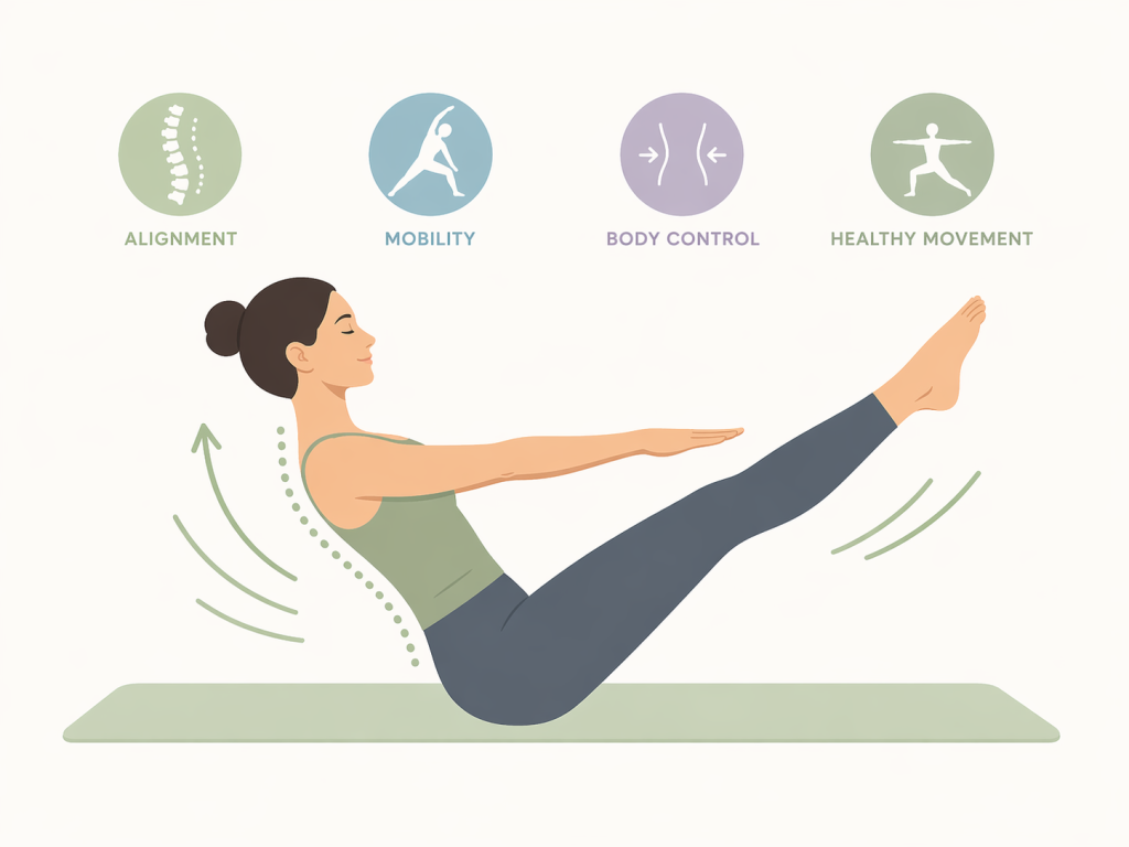 Pilates focuses on strengthening the muscles that support the spine, improving posture, and helping the body move more efficiently. Over time, this can help reduce tension and improve overall comfort.