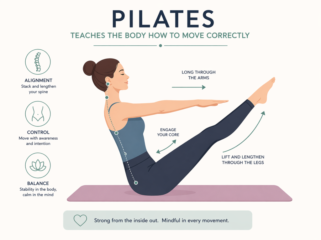 Pilates teaches the body how to move correctly.