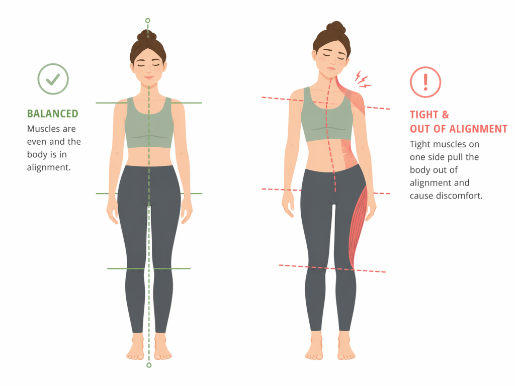 Tight muscles can pull the body out of alignment and cause discomfort.